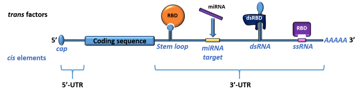 mRNAs contain untranslated regions (UTRs) in their 5’ and 3’ termini that are full of cis-regulatory elements. Those can be structured motifs, extended double-stranded stretches of RNA or short linear sequences. It appears that mRNAs are regulated through the interplay of multiple of these cis elements, often organized in hubs. trans-acting factors are mainly microRNAs and RNA-binding proteins (RBPs) with their RNA-binding domains. These domains recognize the cis elements and provoke downstream effects for the mRNA resulting e.g., in mRNA decay, protection, splicing, transport or its translational inhibition.